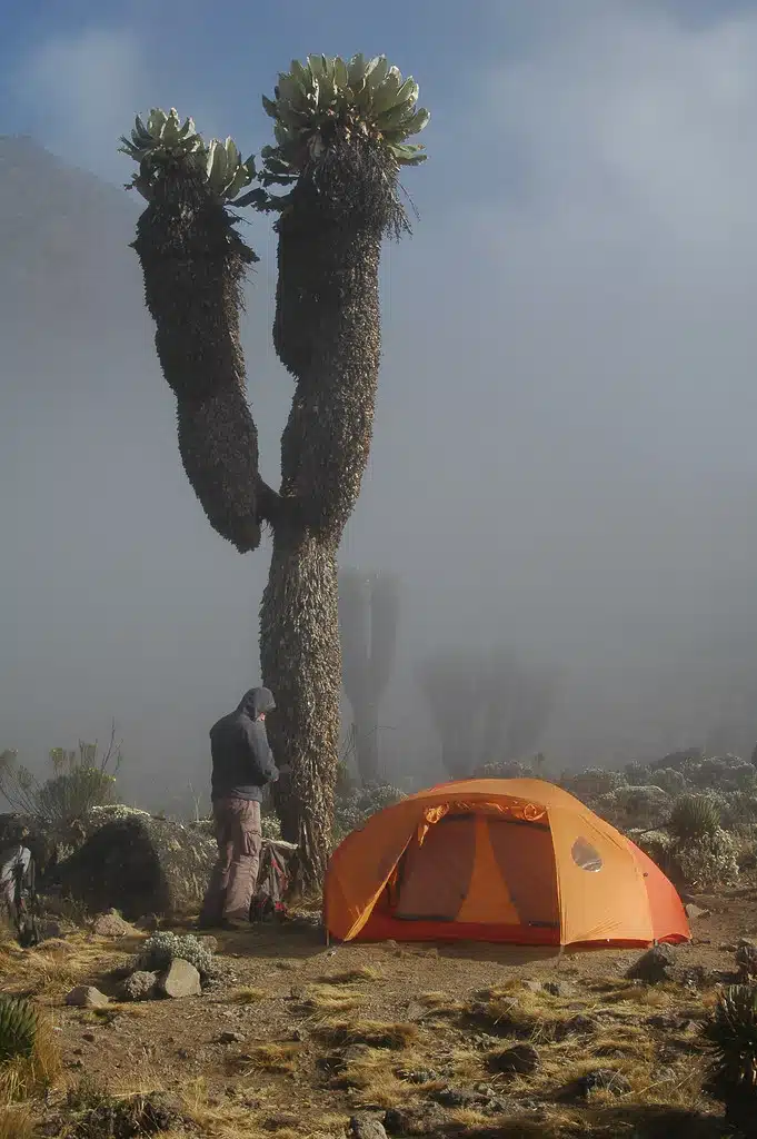 You then begin your ascent into the rainforest. Expect rain, mud and fog during this 18km section of the trek. Keep an eye out for wildlife too, including colobus monkeys! About halfway you will stop for lunch and arrive at Machame Camp (2980) in the late afternoon or early evening. On average you need 7 hours for the ascent. The porters and cook, moving very quickly up the mountain, reach the camp in front of you and set up your tents, boil drinking water and prepare snacks for your arrival. Temperatures can drop to freezing overnight in the mountains, so be prepared!